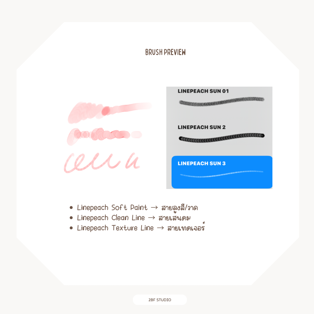 บรัชเซ็ตสไตล์ Linepeach Sun ที่ออกแบบมาเพื่อการวาดภาพแนวมินิมอล ใช้งานง่าย เหมาะสำหรับวาด คน อาหาร และสิ่งของ ให้ลุคสะอาด น่ารัก และดูเป็นธรรมชาติ